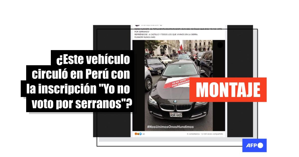 “KEIKO FUJIMORI ES TOTALMENTE DISCRIMINADOR VEAN ESE VEHÍCULO QUE DICE ‘YO NO VOTO POR SERRANOS’ REFIRIÉNDOSE A CASTILLO Y TODOS LOS QUE VIVIMOS EN LA SIERRA”, se lee en publicaciones en Facebook (1, 2) que comparten la fotografía de un automóvil negro de matrícula peruana.