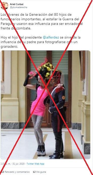 En conclusión, la foto de la drag queen junto al granadero fue hecha en 2013, no durante la pandemia de COVID-19 y el protagonista no es Estanislao, el hijo del presidente argentino, Alberto Fernández.