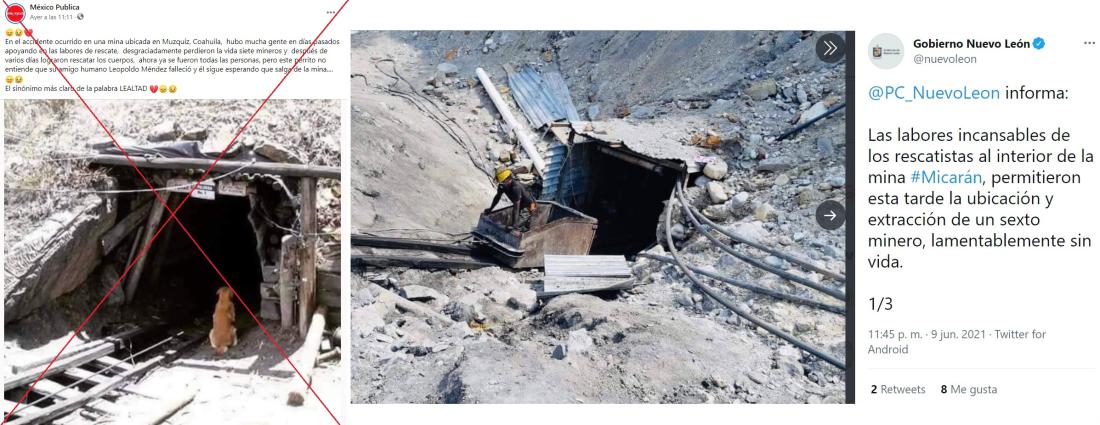 Al buscar las palabras clave “Micarán”, “mina”, “Coahuila” y “entrada” en Google se hallaron fotos del lugar del incidente en un tuit del Gobierno del estado mexicano de Nuevo Léon, que colaboró en el rescate de los mineros atrapados.