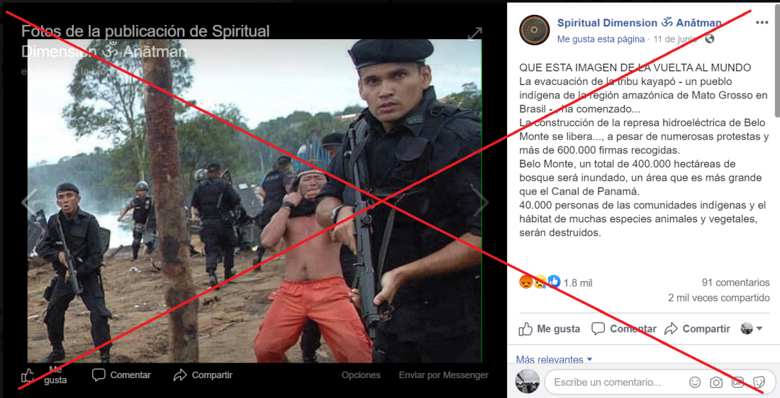 Las publicaciones viralizadas no solo vinculan la fotografía con un hecho con el que no tiene relación, sino que también introducen un error al referirse a la ubicación que mencionan. El texto asegura que el desalojo ocurrió debido a que la tribu kayapó defendía sus tierras de la construcción de la represa hidroeléctrica de Belo Monte, en la región de Mato Grosso.