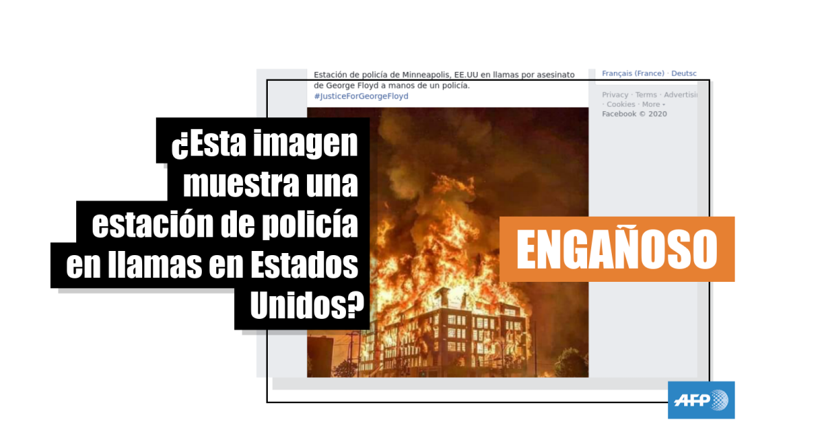 “Estación de policía de Minneapolis en llamas por asesinato de George Floyd. ACAB”, dice una publicación compartida más de 29.000 veces en Facebook desde el 28 de mayo, con la imagen de un edificio en llamas.