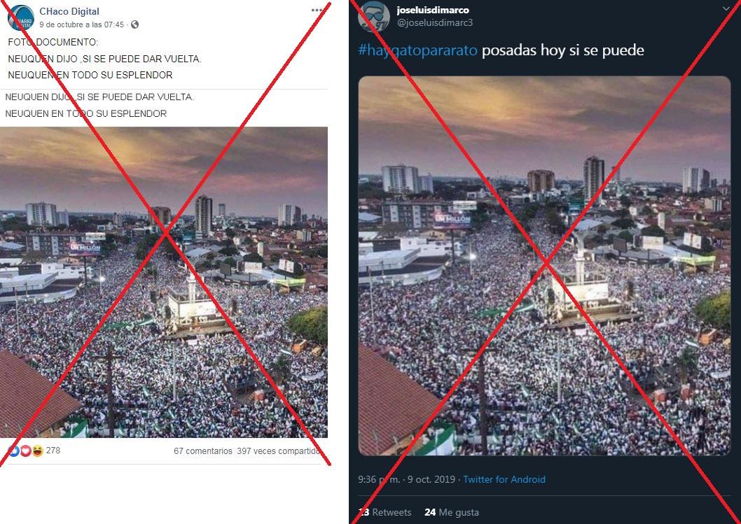 “NEUQUÉN EN TODO SU ESPLENDOR”, dicen varias publicaciones que circulan en Facebook (1, 2 y 3) y en Twitter (1 y 2) desde el 8 de octubre pasado. Las publicaciones incluyen la imagen de un acto multitudinario y aseguran fue un evento de la campaña de Macri. Al día siguiente, volvió a circular en Twitter y en Facebook (1 y 2), afirmando que se trató de un acto del presidente argentino en Posadas.
