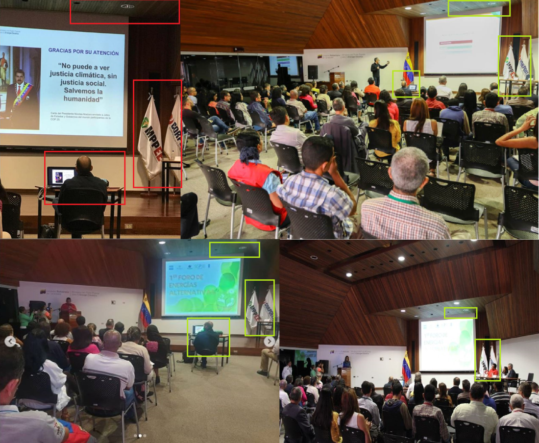 Algunos detalles en el auditorio generaron dudas entre los usuarios que comentaron la publicación viral. “No creo que en una conferencia mundial sobre cambio climático hayan unas banderas de corpoelec [la empresa estatal encargada del servicio de electricidad en Venezuela, NDLR]”, señala uno de ellos.