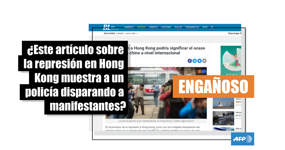 “La Policía agrede a los manifestantes en Hong Kong”, dice la descripción de una foto publicada el 27 de mayo de 2020 en un artículo del sitio web BLes Mundo titulado “La represión a Hong Kong podría significar el ocaso del régimen chino a nivel internacional”.