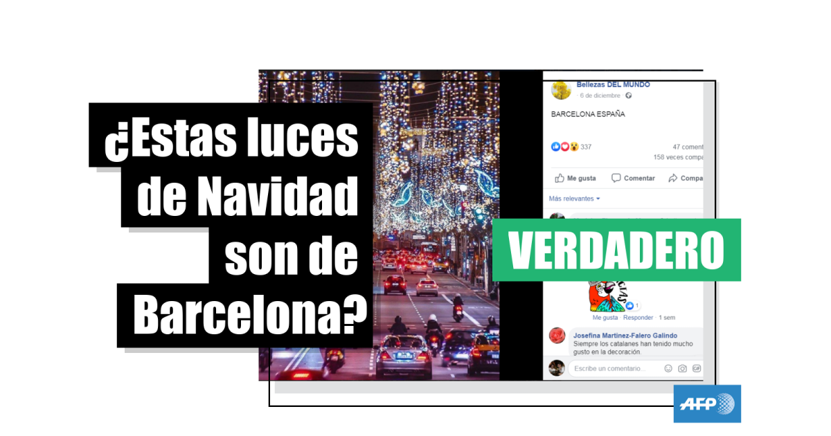 Por otro lado, el fotógrafo de la AFP Josep Lago tomó una serie de imágenes de las luces de Navidad en Barcelona. Una de ellas, del 29 de noviembre de 2019, coincide con los motivos decorativos que se pueden observar en la imagen viral, como son las columnas luminosas amarillas y las alas de mariposa de color azul en su base. El fotógrafo confirmó que sacó la foto en el Paseo de Gracia, una de las principales calles de la ciudad.