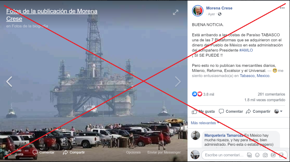 “Está arribando a las costas de Paraíso TABASCO una de las 7 Plataformas que se adquirieron con el dinero del Pueblo de México en esta administración del compañero Presidente #AMLO ¡ SI SE PUEDE !!”, dice una de las publicaciones compartidas más de 7.400 veces en Facebook (1, 2, 3) y muestra la imagen de una plataforma petrolera remolcada, supuestamente en Paraíso, municipio del estado de Tabasco, en el sureste de México.