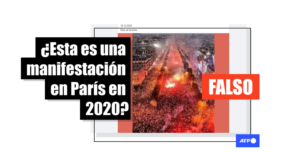 La fotografía fue publicada en Facebook con la leyenda “18.12.2020 Paris se levanta”, y con la afirmación “la gente levantándose contra su gobierno”, añadiendo en esta entrada la frase “y sin ayuda de Trump”. Esta publicación dice que la imagen se produjo “ESTA MADRUGADA”. Esta otra, por ejemplo, añade que la protesta sería “ante el Golpe de estado Global que nos han dado, con la excusa de un bicho que nunca tuvo cualidad de pandemia”, en referencia al nuevo coronavirus.