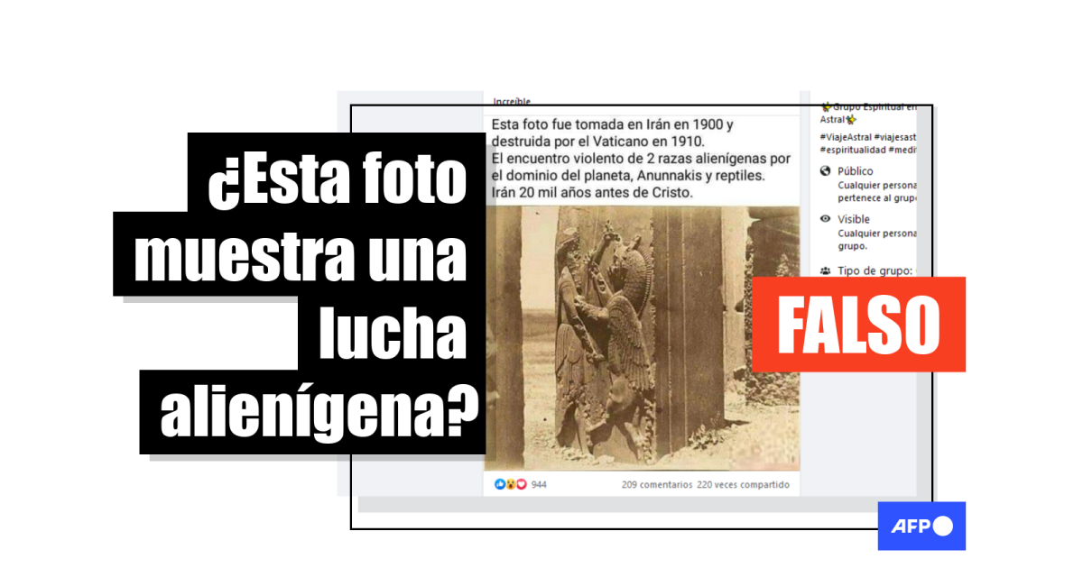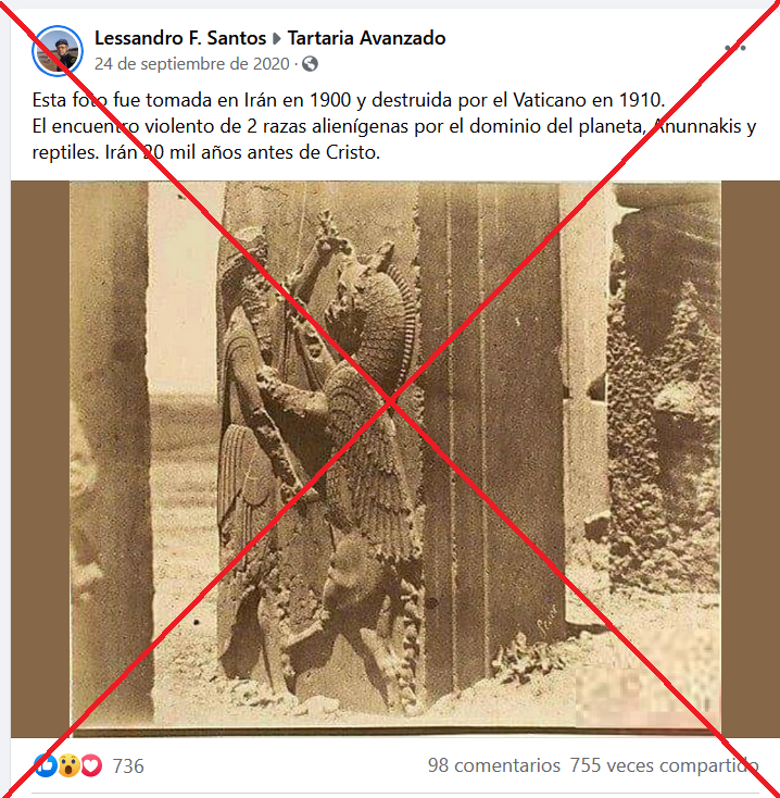 Publicaciones en Facebook (1, 2, 3), Instagram (1, 2) y Twitter (1, 2) replican el mismo contenido: “Esta foto fue tomada en Irán en 1900 y destruida por el Vaticano en 1910, Anunnakis y reptiles. Irán 20 mil años antes de Cristo”.