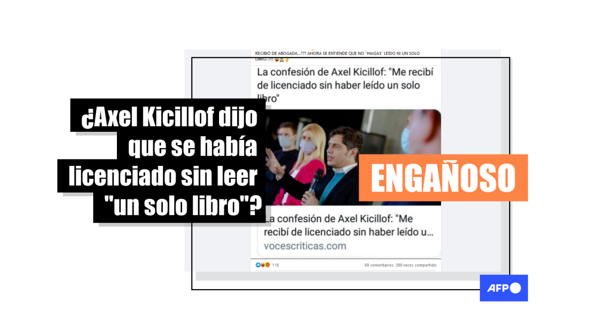 “Kicillof reconoce con orgullo que se recibió sin haber leído nunca un libro de economía. Se dan cuenta el nivel de mediocridad de la gente que nos gobierna???”, se lee en una publicación en Facebook que está acompañada por un breve video, en el que se ve al exministro de Economía (2013-2015) ante un auditorio. “Me recibí de licenciado en Economía sin haber leído un solo libro en mi carrera, como bibliografía. Ningún libro completo de teoría económica ni de economía”, se escucha decir al funcionario en la secuencia viralizada.