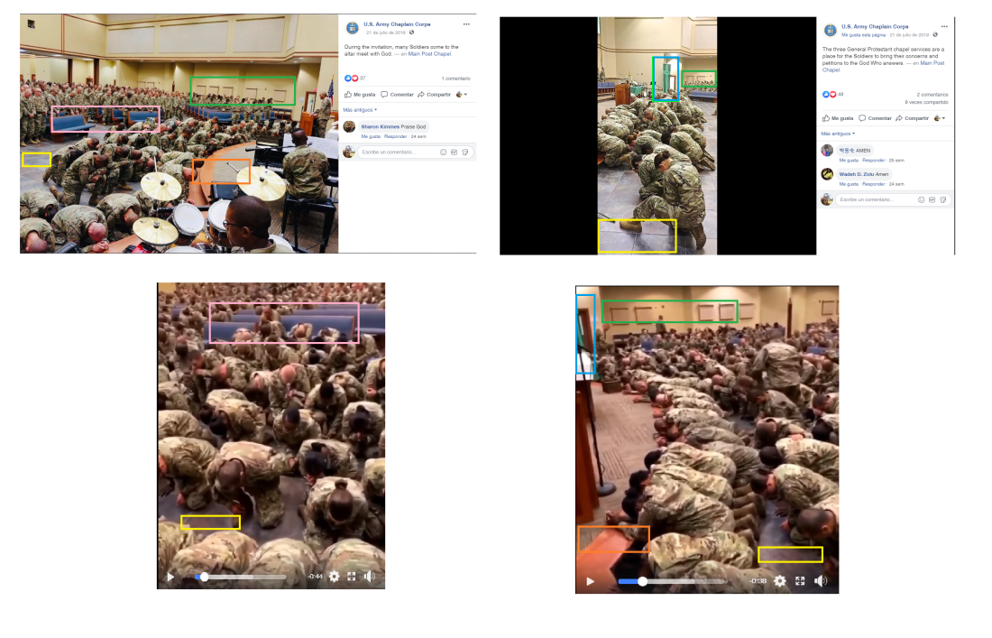Las fotografías publicadas en la página en Facebook del Cuerpo de Capellanía del Ejército de Estados Unidos muestran similitudes con el escenario en que se filmó el video viralizado desde principios de año: el piso del lugar, las sillas azules, las paredes amarillas, la forma del estrado y una bandera verde izada al lado de la tarima.