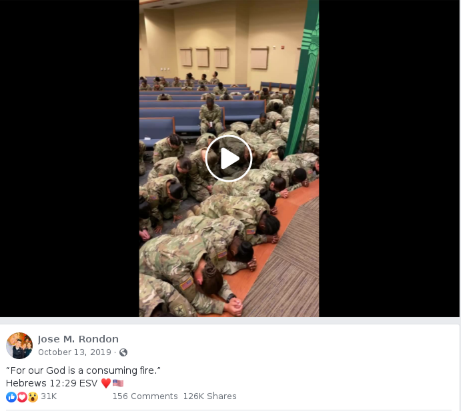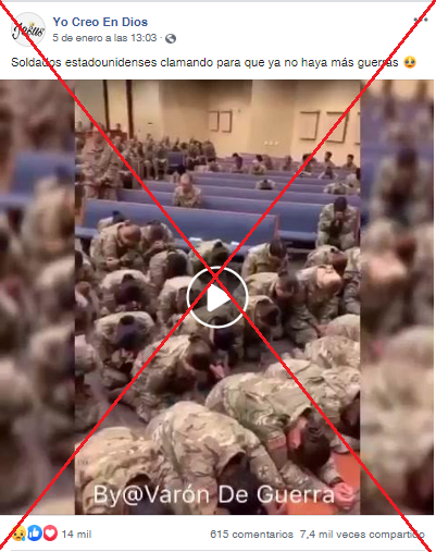 “Circula video de soldados orando antes de salir al Medio Oriente”, dice una publicación en Facebook que ha sido compartida al menos 6.100 veces y que es acompañada por una grabación de 50 segundos que muestra a militares orando en una iglesia.