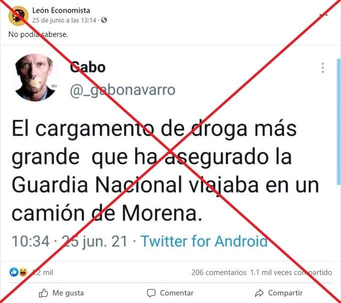 Las publicaciones han sido difundidas en Twitter (1, 2) y en Facebook (1, 2, 3), luego que el 23 de junio pasado la Guardia Nacional y la Secretaría de la Defensa Nacional (Sedena) encontraran 14 bolsas negras de plástico con metanfetamina de cristal durante una inspección de rutina a un autobús de pasajeros en Apatzingán, Michoacán (oeste).