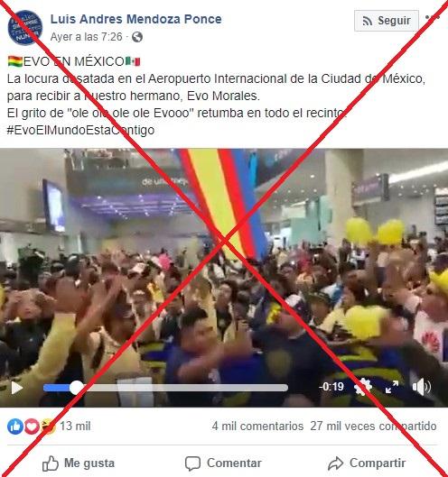 “EVO EN MÉXICO La locura desatada en el Aeropuerto Internacional de la Ciudad de México, para recibir a nuestro hermano, Evo Morales. El grito de ‘ole ole ole ole Evooo’ retumba en todo el recinto”, señala una publicación de Facebook compartida más de 27.000 veces.