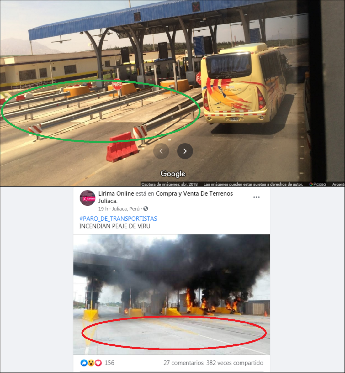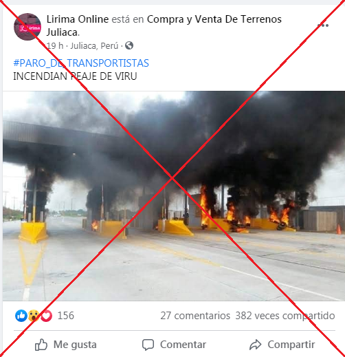 La imagen de un peaje en llamas no fue tomada recientemente en Perú; es al menos de 2016