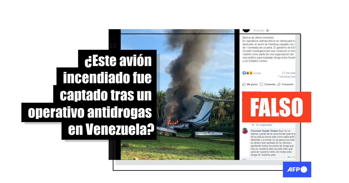 “En operativos antinarcóticos en Venezuela fue destruido un avión de Helidosa cargado con más de 1 tonelada de cocaína. El gobierno de EEUU ha iniciado investigaciones que conducen a Gonzalo Castillo [empresario y candidato presidencial de República Dominicana, NDLR] como parte de una organización del narcotráfico para trasladar droga entre Suramérica y los Estados Unidos”, dice una de las publicaciones en Facebook (1, 2) que muestra la imagen de un avión con fuego, que ha sido viralizada en varios grupos. Otra publicación en Twitter indica que el hecho sucedió en Colombia.