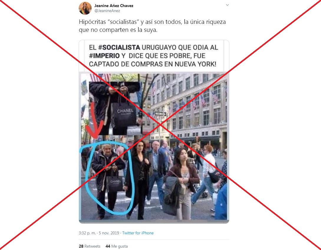 Su mensaje incluye una captura de una publicación en Facebook en la que se ve supuestamente al exmandatario uruguayo (2010-2015) con una bolsa de compras de la exclusiva casa de modas francesa Chanel, caminando por una calle de Nueva York.