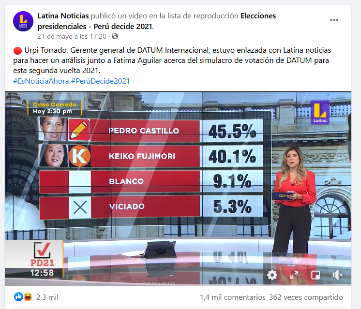 En esa edición, la conductora Fátima Aguilar presentó las cifras de un simulacro de votación realizado por la encuestadora DATUM Internacional sobre una base de 1.201 encuestados. El resultado le dio a Castillo un 45,5% de proyección de voto y a Fujimori un 40,1%. El voto en blanco y el viciado figuran con un 9,1% y un 5,3% respectivamente.