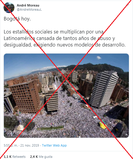 La fotografía también fue compartida por León Valencia, analista colombiano y director de la Fundación Pares, un centro de investigación de la violencia y el conflicto armado en Colombia. El mensaje de Valencia fue: “Han visto esto alguna vez? (sic)”. Aunque no menciona explícitamente las protestas, la publicación, con más de 5.600 retuits y 17.000 me gusta, se hizo también el 21 de noviembre.