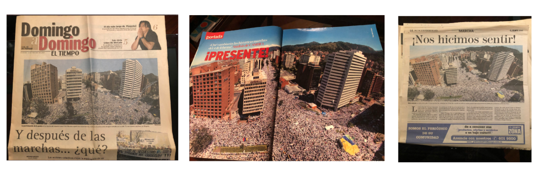 AFP Factual consultó con Danilo Pizarro, jefe de archivo de redacción del diario El Tiempo, casa editorial propietaria de Cambio, y confirmó que la foto fue publicada por ese diario así como en el semanario El Tiempo Zona (del 7 al 13 de febrero de 2008) y en la separata dominical de El Tiempo del 10 de febrero para ilustrar la masiva manifestación contra la exguerrila de las FARC.