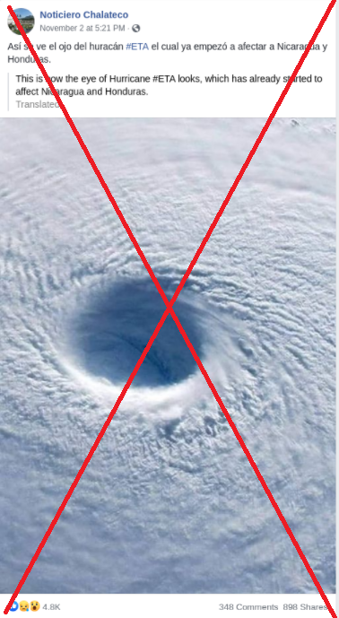 “Así se ve el ojo del huracán #ETA el cual ya empezó a afectar a Nicaragua y Honduras”, dice una publicación en Facebook (1, 2, 3) que muestra una supuesta imagen del huracán que afectó Centroamérica.