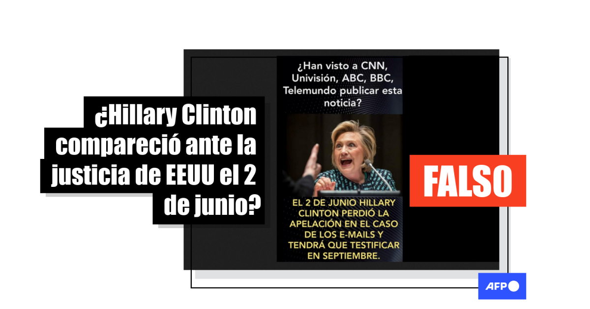 “¿Han visto a CNN, Univisión, ABC, BBC, Telemundo publicar esta noticia?”, dice un meme ampliamente compartido en Facebook (1, 2). “El 2 de junio Hillary Clinton perdió la apelación en el caso de los emails y tendrá que testificar en septiembre”.