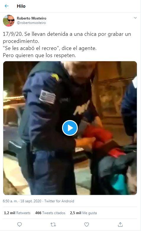 “¿Usted nos quiere acompañar también a ver la grabación? ¿Usted sabe que está penada por la LUC? Usted está detenida”, le dice un policía uruguayo a una mujer que filma una detención, en un video que fue retuiteado más de 1.600 veces y compartido más de 5.200 veces en Facebook (1, 2, 3).