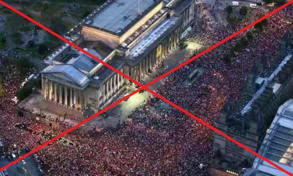 Esta imagen tampoco corresponde al evento pro-Trump ni a Washington. Fue tomada en mayo de 2005 en Liverpool, Reino Unido y muestra a fans del club de fútbol Liverpool festejando su triunfo en la Final de la Liga de Campeones alrededor del edificio St. George's Hall. La imagen es del fotógrafo Martin Rickett y está alojada en Getty Images.