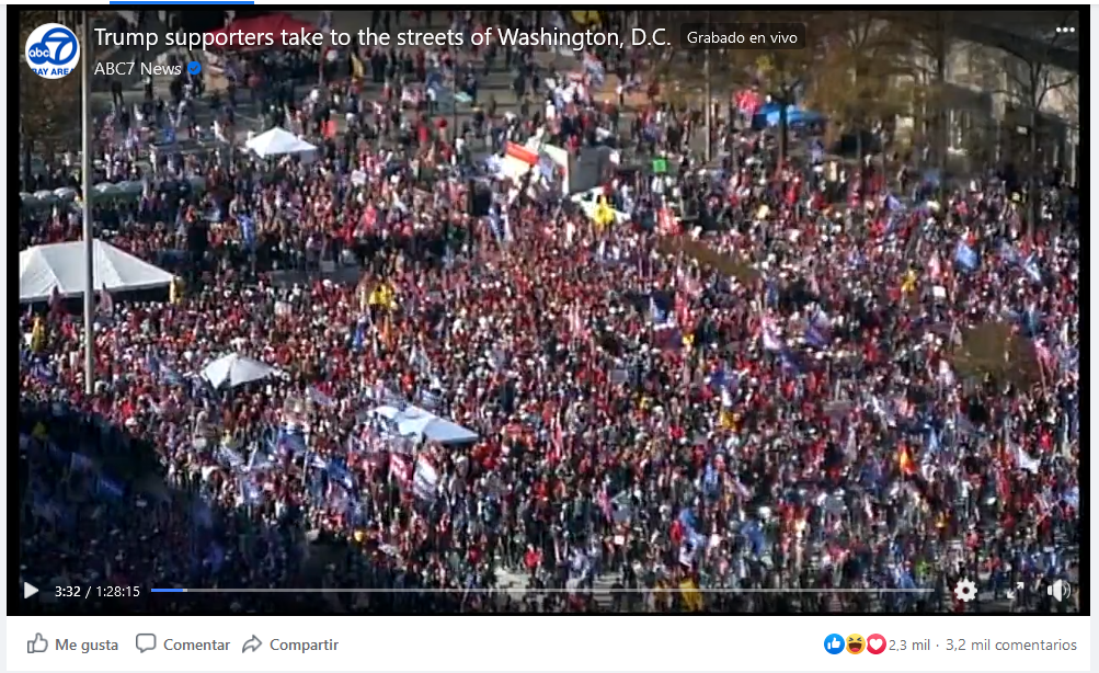 El 14 de noviembre pasado, unos 10.000 partidarios de Trump se congregaron en Washington D.C. antes de marchar hacia la Corte Suprema. El tamaño de la multitud fue motivo de debate en redes sociales. Si bien la mayoría de los medios, incluido Fox News, informaron que varios miles de personas asistieron al evento, algunos miembros del equipo de Trump, como la secretaria de prensa de la Casa Blanca, Kayleigh McEnany, aseguraron que atrajo a más de un millón de personas.