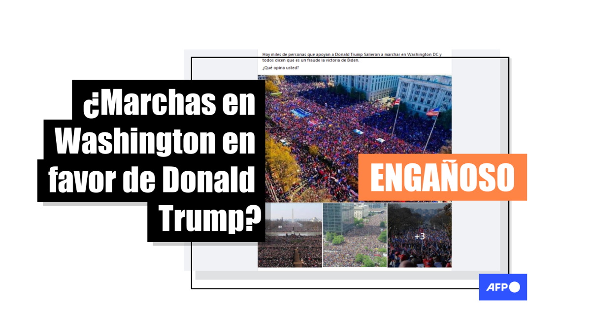 “Hoy miles de personas que apoyan a Donald Trump salieron a marchar en Washington DC y todos dicen que es un fraude la victoria de Biden”, se lee en una publicación en Facebook (1, 2, 3) que incluye un conjunto de imágenes de multitudes reunidas en las calles.
