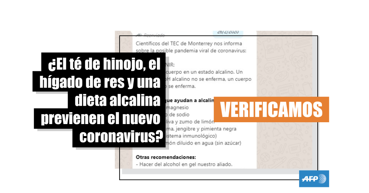 Una de las recomendaciones que hacen las publicaciones virales para “prevenir” el contagio de este nuevo virus, surgido a finales de 2019 en la ciudad china de Wuhan, es “mantener el cuerpo en un estado alcalino”, pues “un cuerpo con pH alcalino no se enferma, un cuerpo con pH ácido se enferma”.