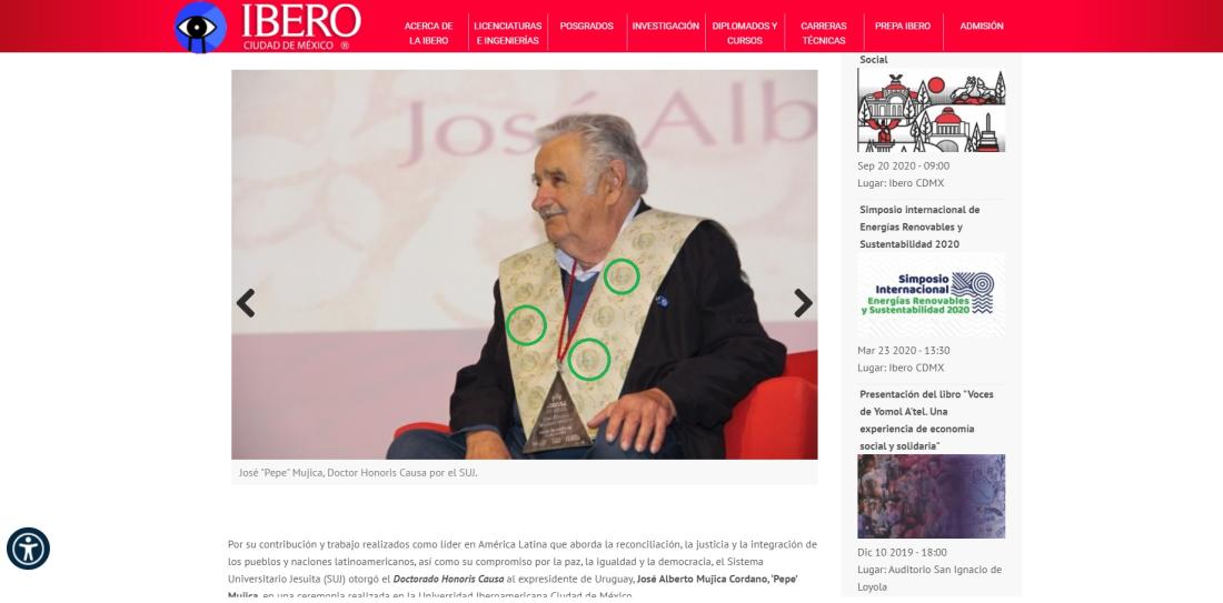 El pasado 2 de diciembre Mujica recibió de parte del Sistema Universitario Jesuita mexicano (SUJ) el Doctorado Honoris Causa de la Universidad Iberoamericana de Ciudad de México, por “su contribución y trabajo realizados como líder en América Latina que aborda la reconciliación, la justicia y la integración de los pueblos y naciones latinoamericanos, así como su compromiso por la paz, la igualdad y la democracia”.