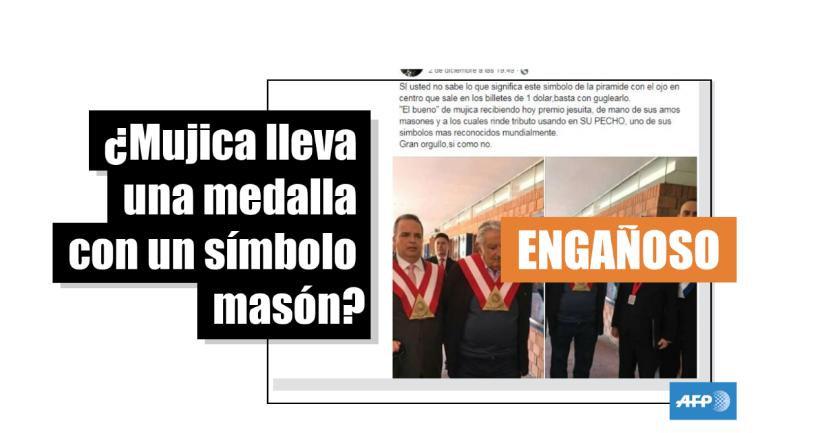 Según la publicación, que circula en Facebook (1, 2, 3, 4) y Twitter desde el 2 de diciembre pasado y que ha sido compartida cerca de 500 veces, Mujica recibió un “premio jesuita de mano de sus amos masones” a los que “rinde tributo” utilizando “uno de sus símbolos más reconocidos mundialmente”.