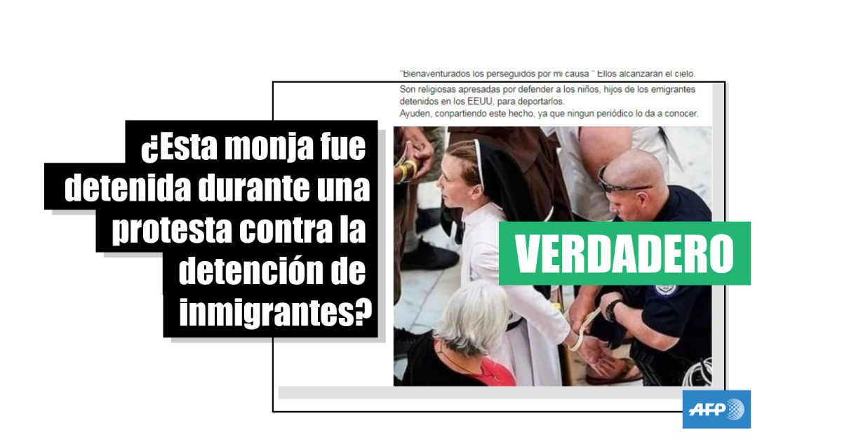 “Son religiosas apresadas por defender a los niños, hijos de los emigrantes detenidos en los EEUU, para deportarlos. Ayuden, compartiendo este hecho, ya que ningún periódico lo da a conocer”, señala una publicación en Facebook del 14 de febrero de 2020, compartida más de 1.000 veces. Allí se muestra la imagen de una mujer vestida con atuendo religioso esposada por un policía.