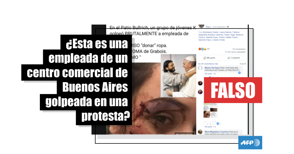 Reverso pudo comprobar mediante una búsqueda inversa de imágenes en Google que la mujer con la herida facial no es argentina y que tampoco trabaja en el Patio Bullrich, ubicado en el barrio de Recoleta, en Buenos Aires.