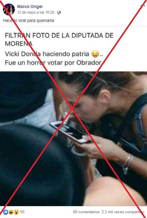 En la pieza, compartida más de 20.000 veces en Facebook (1, 2 y 3), se ve a una mujer aspirando cocaína sobre un celular que tiene en la mano, pero no hay datos sobre cuándo ni dónde fue tomada. “Vicki Donda haciendo patria. Fue un horror votar por [el presidente Méxicano Andrés Manuel López] Obrador”, se lee en algunos memes.