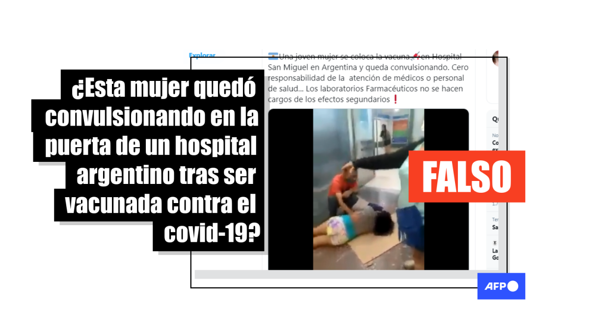 La secuencia, de 4:12 minutos, circula en Facebook (1, 2, 3, 4) y Twitter (1, 2). “Una joven mujer se coloca la vacuna en Hospital San Miguel en Argentina y queda convulsionando. Cero responsabilidad de la atención de médicos o personal de salud... Los laboratorios farmacéuticos no se hacen cargos de los efectos secundarios”, se lee en algunas entradas.