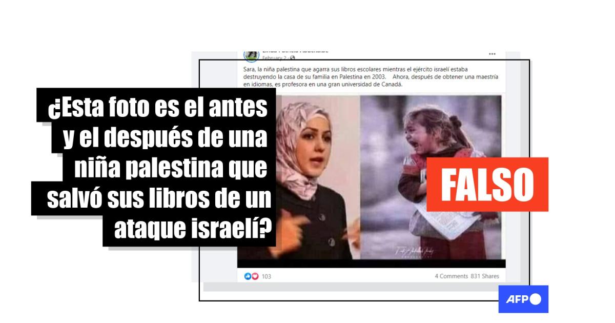 “La niña palestina Sarah, que se mantuvo fiel a sus libros cuando su casa fue demolida por la ocupación israelí en 2003, ahora tiene una maestría en idiomas y trabaja como profesora en una prestigiosa universidad canadiense”, dice la leyenda de las fotografías, que circulan desde 2019 pero volvieron a compartirse en mayo de 2021, con el trasfondo de un nuevo estallido de violencia entre israelíes y palestinos.