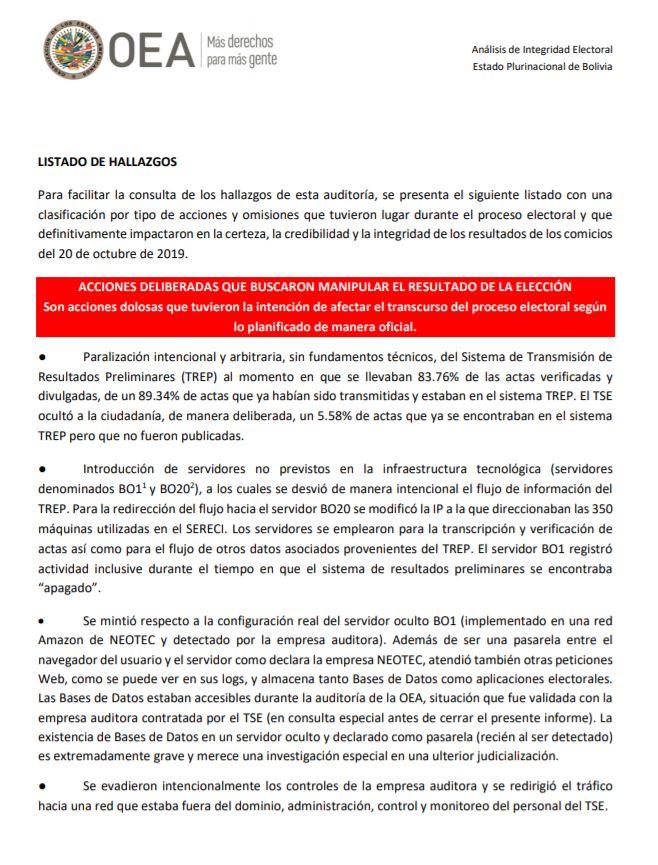 El texto del informe concluye que hubo manipulaciones e irregularidades que “no permiten tener certeza sobre el margen de victoria del candidato Morales sobre el candidato [Carlos] Mesa” y agrega que “a partir de la abrumadora evidencia encontrada, lo que sí es posible afirmar es que ha habido una serie de operaciones dolosas encaminadas a alterar la voluntad expresada en las urnas”.
