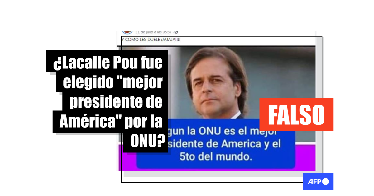 “Según la ONU, es el mejor presidente de América y el 5to del mundo”, señala una imagen que circula en Facebook al menos desde el 11 de julio (1, 2, 3, 4, 5) y ha sido compartida más de 2.800 veces. El texto acompaña una foto del presidente de Uruguay, Luis Lacalle Pou.