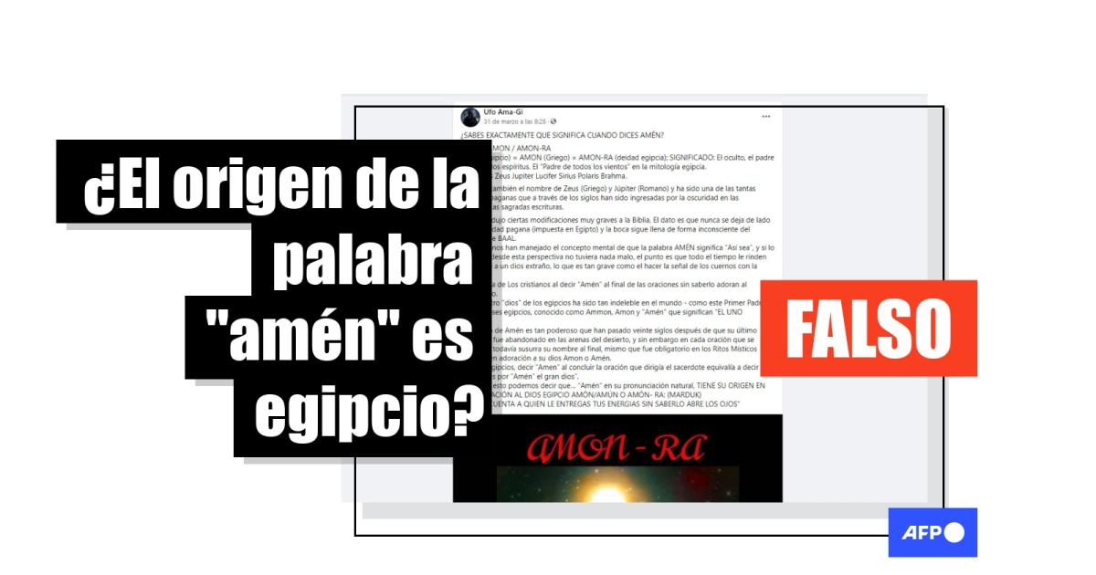 “¿SABES EXACTAMENTE QUE SIGNIFICA CUANDO DICES AMÉN? AMÉN / AMON / AMON-RA AMEN (Egipcio) = AMON (Griego) = AMON-RA (deidad egipcia); SIGNIFICADO: El oculto, el padre de todos los espíritus”, dicen las publicaciones en Facebook (1, 2, 3) y Twitter (1, 2). El contenido también circula en inglés (1).