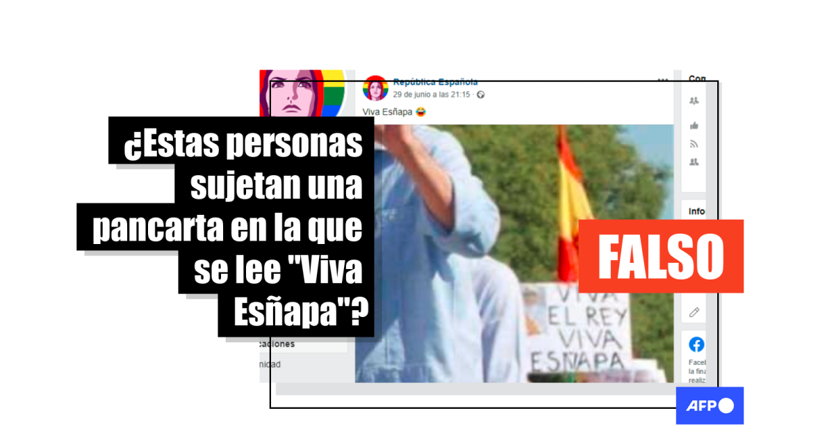 “Viva EsÑapa.... Esñapoles [sic] [...]”, dice la leyenda de una de las publicaciones en Facebook (1, 2, 3, 4), que comparten una imagen del monarca en Sevilla el pasado 29 de junio, con un grupo de gente entre la que se ve la supuesta pancarta mal escrita. La imagen también circula en Instagram y en Twitter (1), donde ha sido retuiteada miles de veces.