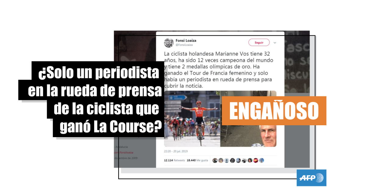 “La ciclista holandesa Marianne Vos tiene 32 años, ha sido 12 veces campeona del mundo y tiene 2 medallas olímpicas de oro. Ha ganado el Tour de Francia femenino y solo había un periodista en rueda de prensa para cubrir la noticia”, señala el periodista Fonsi Loaiza en su tuit, acompañado de una imagen de Vos cruzando victoriosa la meta y otra del periodista Cossins. Este había acompañado su foto con el siguiente comentario originalmente en inglés: “Esto es lo que Marianne Vos vio en su rueda de prensa de La Course justo ahora. Un montón de asientos vacíos y yo. Es vergonzoso que una de las mejores corredoras de todos los tiempos sea ignorada así”.