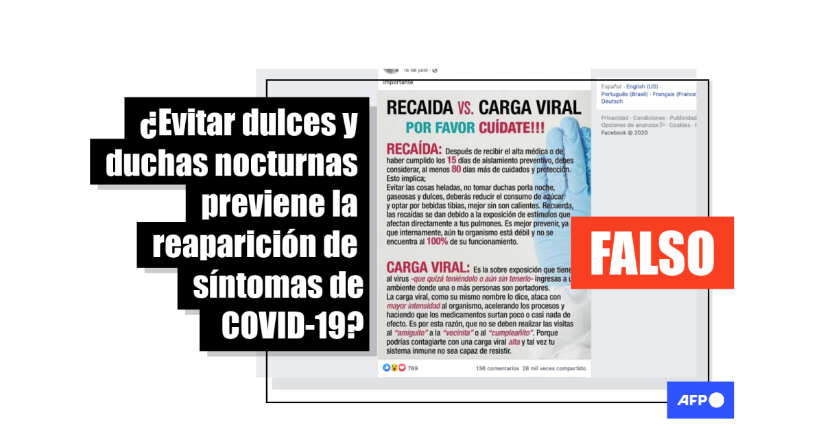 En conclusión, es falso que una persona que haya recibido el alta médica por COVID-19 pueda prevenir una reaparición de síntomas evitando el consumo de dulces, bebidas heladas o duchas nocturnas. Tales hábitos no tienen incidencia alguna en el desarrollo de la enfermedad. Tampoco es cierto que la carga viral refiera a una “sobreexposición al virus”; el concepto hace referencia a la cantidad de virus que tiene una persona, detectada de manera cuantitativa mediante algún tipo de muestra.