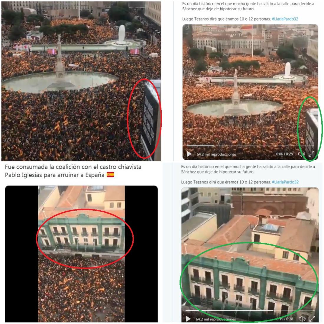 “Ningún medio se ha dignado mencionar ESPAÑA que esta mañana ha estado en la calle” [sic], dice un tuit, con miles de interacciones desde el 4 de enero pasado. “Lo que la prensa calla: la inmensa manifestación de ayer contra la investidura”, titulaba la página web Somatemps el 5 de enero de 2020. Ambas publicaciones incluyen el mismo vídeo, en el que se puede ver la Plaza de Colón, en el centro de Madrid, y a los asistentes portando banderas de España.