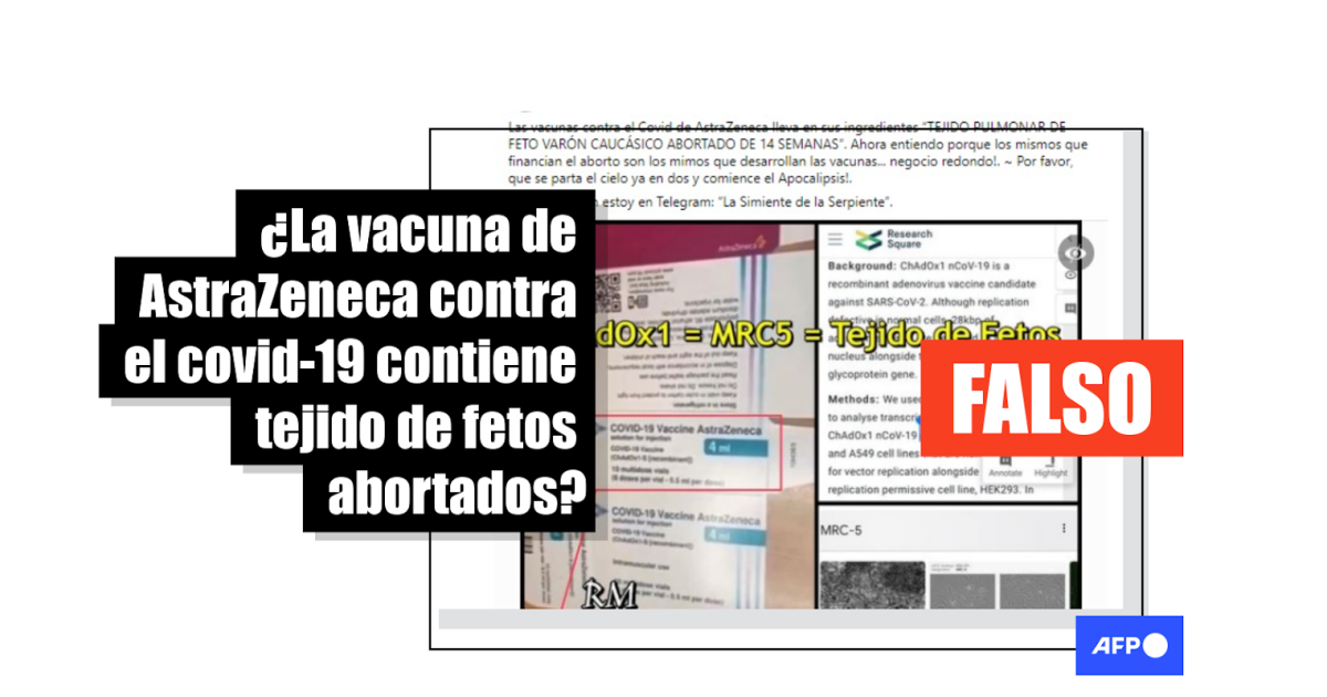 “Las vacunas contra el Covid de AstraZeneca lleva en sus ingredientes ‘TEJIDO PULMONAR DE FETO VARÓN CAUCÁSICO ABORTADO DE 14 SEMANAS’”, afirman varias publicaciones en español (1, 2, 3) y en inglés en Facebook.