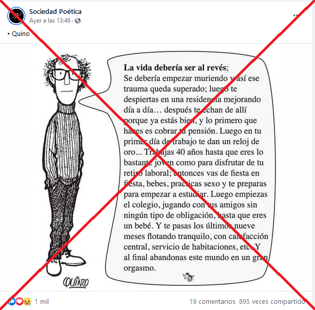 “La vida debería ser al revés. Se debería empezar muriendo y así ese trauma está superado”, comienza un texto compartido más de 10.000 veces desde el 30 de septiembre en Facebook (1, 2), Twitter (1, 2) e Instagram (1, 2).