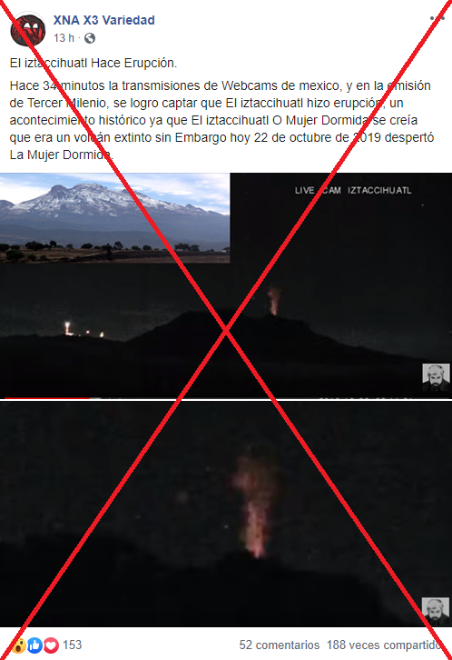 “El iztaccihuatl Hace Erupción… Hace 34 minutos la transmisiones de Webcams de mexico, y en la emisión de Tercer Milenio, se logro captar que El iztaccihuatl hizo erupción, un acontecimiento histórico ya que El iztaccihuatl O Mujer Dormida se creía que era un volcán extinto sin Embargo hoy 22 de octubre de 2019 despertó La Mujer Dormida”, señala una publicación en Facebook que junto con otras en Twitter (1, 2, 3) fueron compartidas más de 1.000 veces.