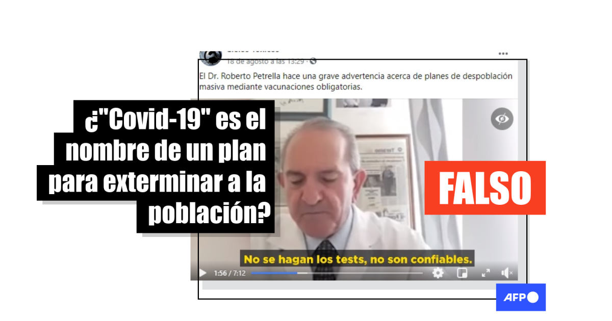 Al inicio del video, Petrella asegura que covid-19 significa “certificado de identificación de vacunación con inteligencia artificial” y que el número 19 “es el año en que fue creado”. También afirma que el covid-19 es un "programa de exterminio masivo" y que "no es el nombre del virus, es más bien el nombre del plan internacional de control y reducción de poblaciones".