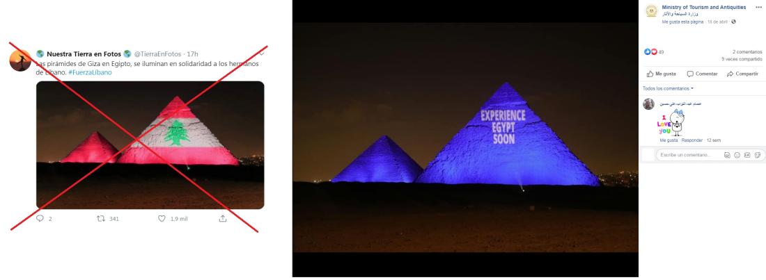 Sin embargo, una búsqueda inversa en Google revela que la imagen en realidad es un montaje hecho a partir de una tomada el 18 de abril de 2020, cuando las autoridades egipcias iluminaron las pirámides en una campaña en ocasión del Día Internacional de los Monumentos y Sitios.