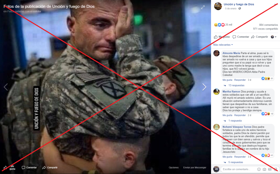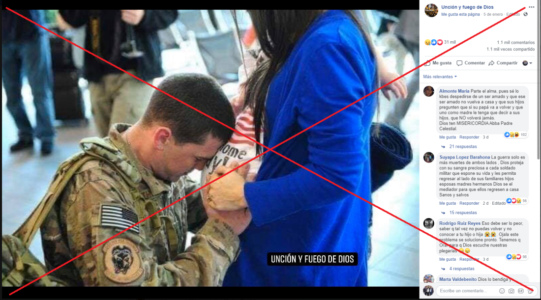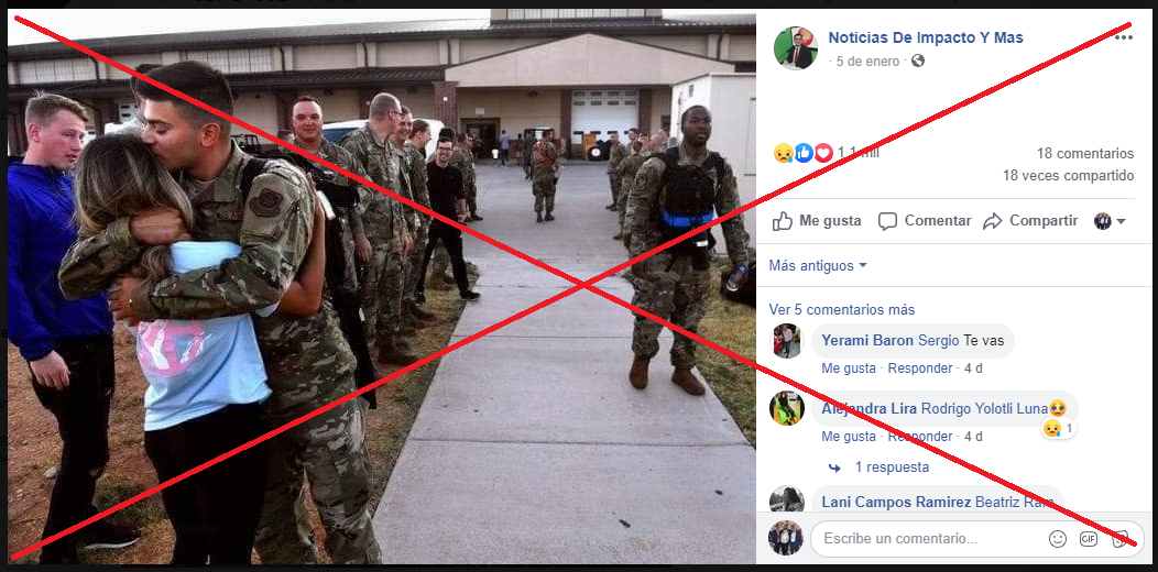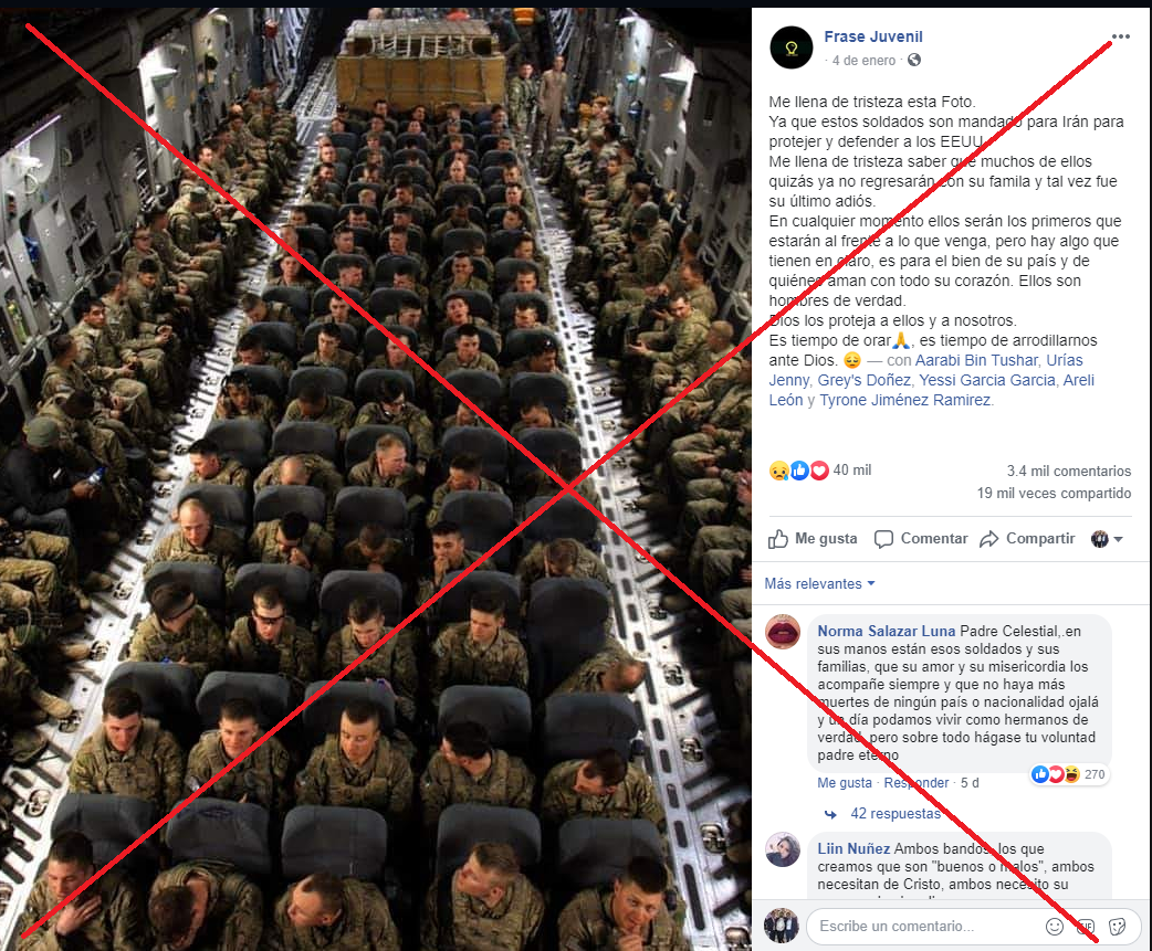 Otra imagen que ha sido compartida en Facebook 19.000 veces muestra a varios militares aparentemente dentro de un avión con la siguiente descripción: “Me llena de tristeza esta Foto. Ya que estos soldados son mandado para Irán para protejer y defender a los EEUU. Me llena de tristeza saber que muchos de ellos quizás ya no regresarán con su famila y tal vez fue su último adiós (...)”.